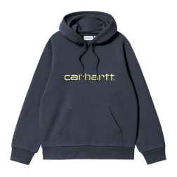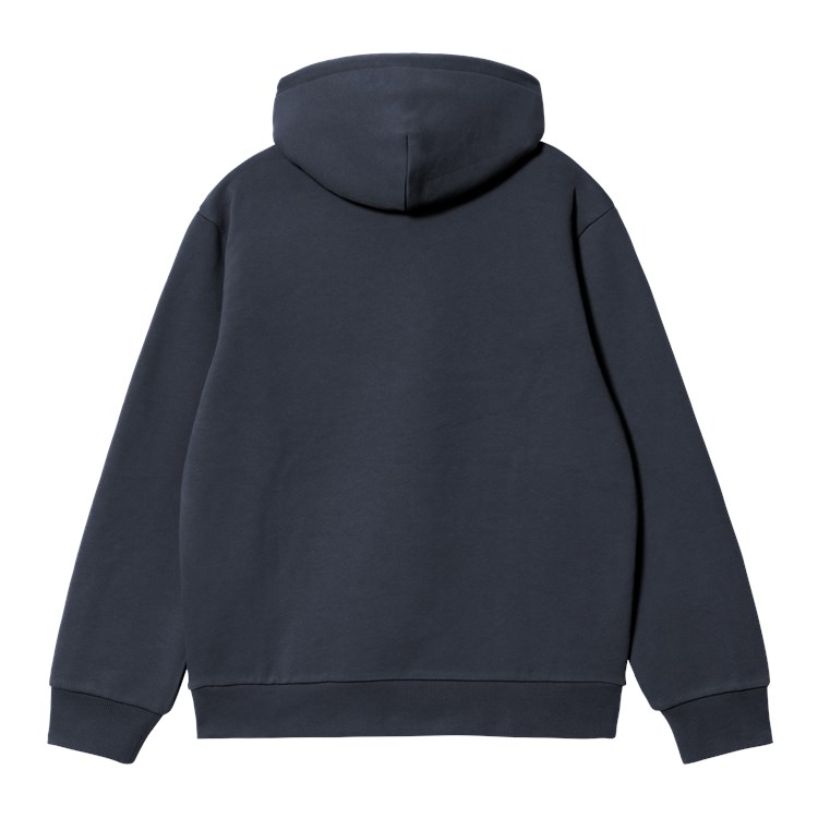Mikina Carhartt s kapucí je vyrobena ve volném střihu z těžkého česaného polybavlněného žerzeje, což znamená, že má měkkou vnitřní vrstvu. Má také klokaní kapsu a žebrovaný lem a manžety. Na hrudi se objevuje vyšívané logo Script.